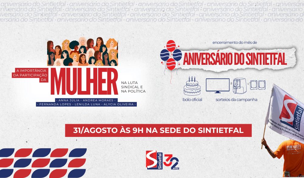 O Sintietfal realiza neste sábado, dia 31 de agosto, às 9 horas, na sede sindical, a comemoração dos seus 32 anos de fundação. A atividade contará com bolo de aniversário, sorteio dos prêmios da campanha de filiação e recadastramento e um debate sobre a importância da participação da mulher na luta sindical e na política.