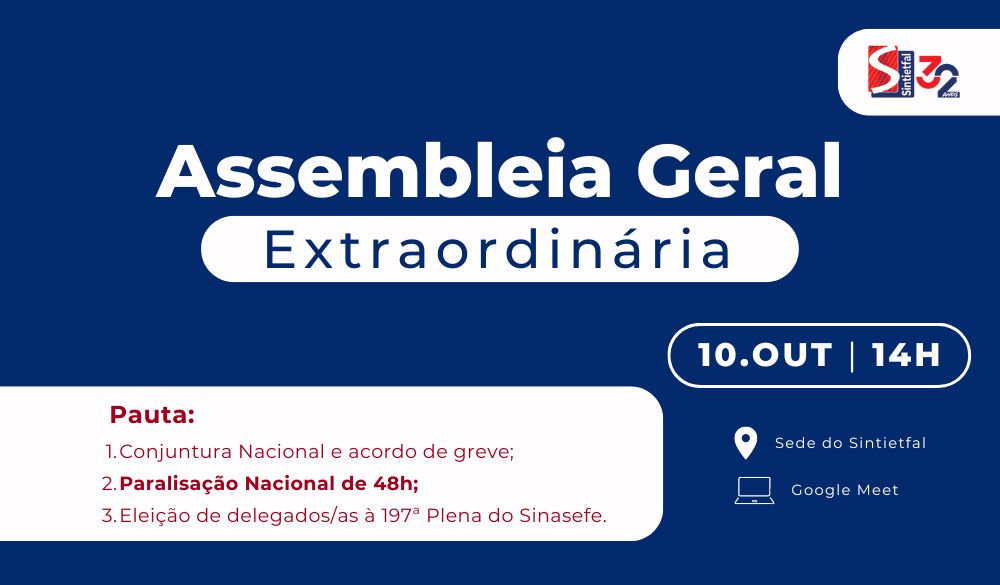 O Sintietfal convoca a todos/as para participar da Assembleia Geral Extraordinária nesta quinta-feira, dia 10, a partir das 14h, em formato híbrido, no auditório Jarede Viana, na sede do sindicato, e através do Google Meet.