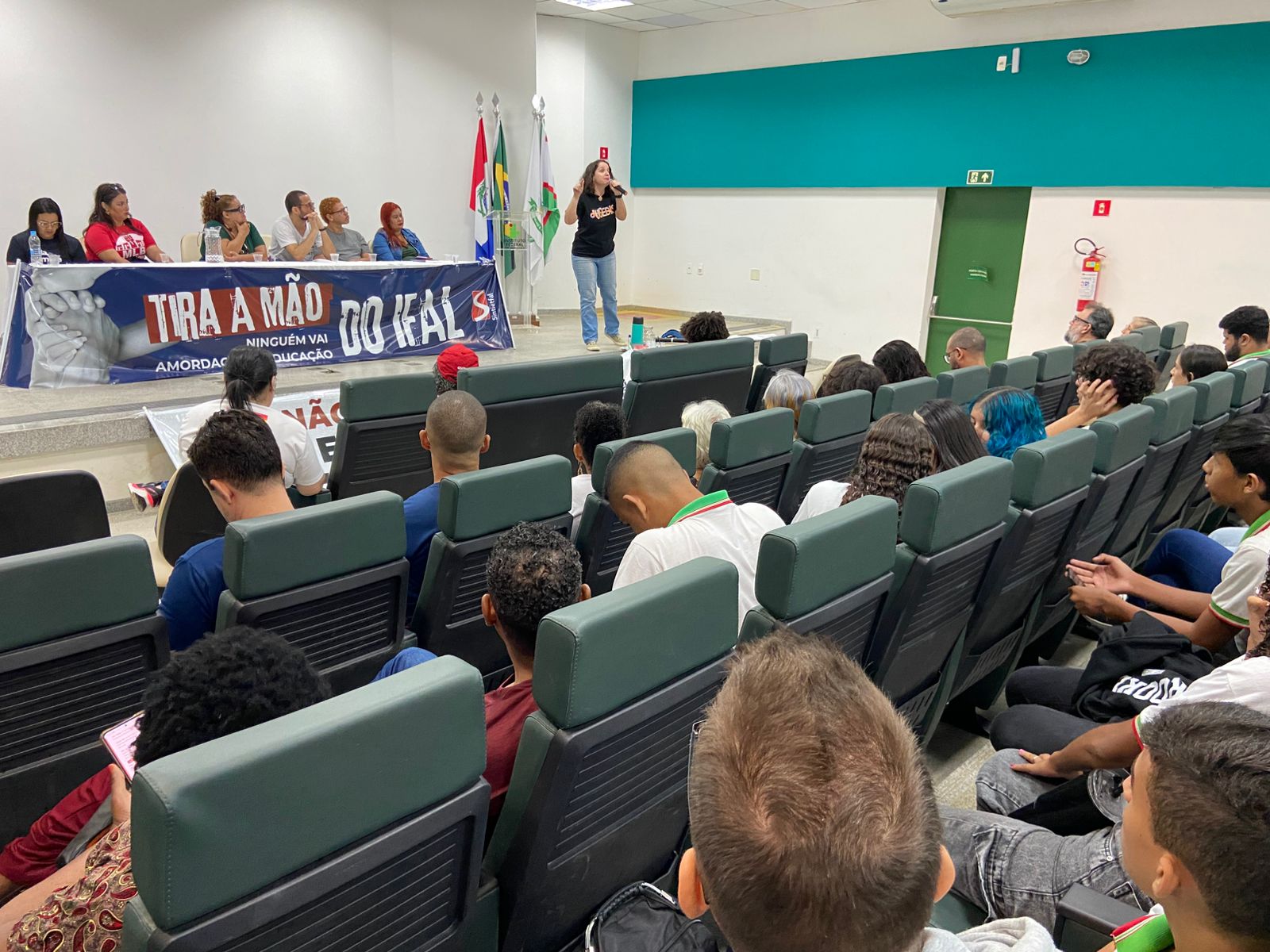 A primeira parte da mobilização ocorreu dentro do Ifal campus Coruripe. No auditório, estudantes, servidoras e servidores ficaram de pé para aplaudir a docente de artes Maria Oliveira. O ato em defesa da liberdade de cátedra contou também com a presença da professora da rede estadual Vaniere Oliveira.